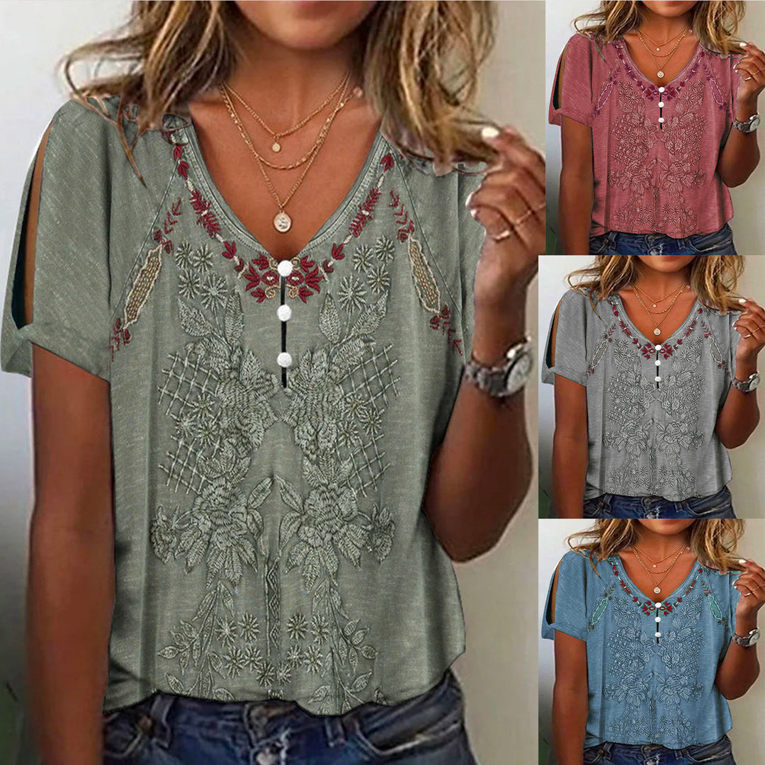 Damen Kurzarmbluse mit floralen Stickereien und Knopfdetails Heidi-Mode