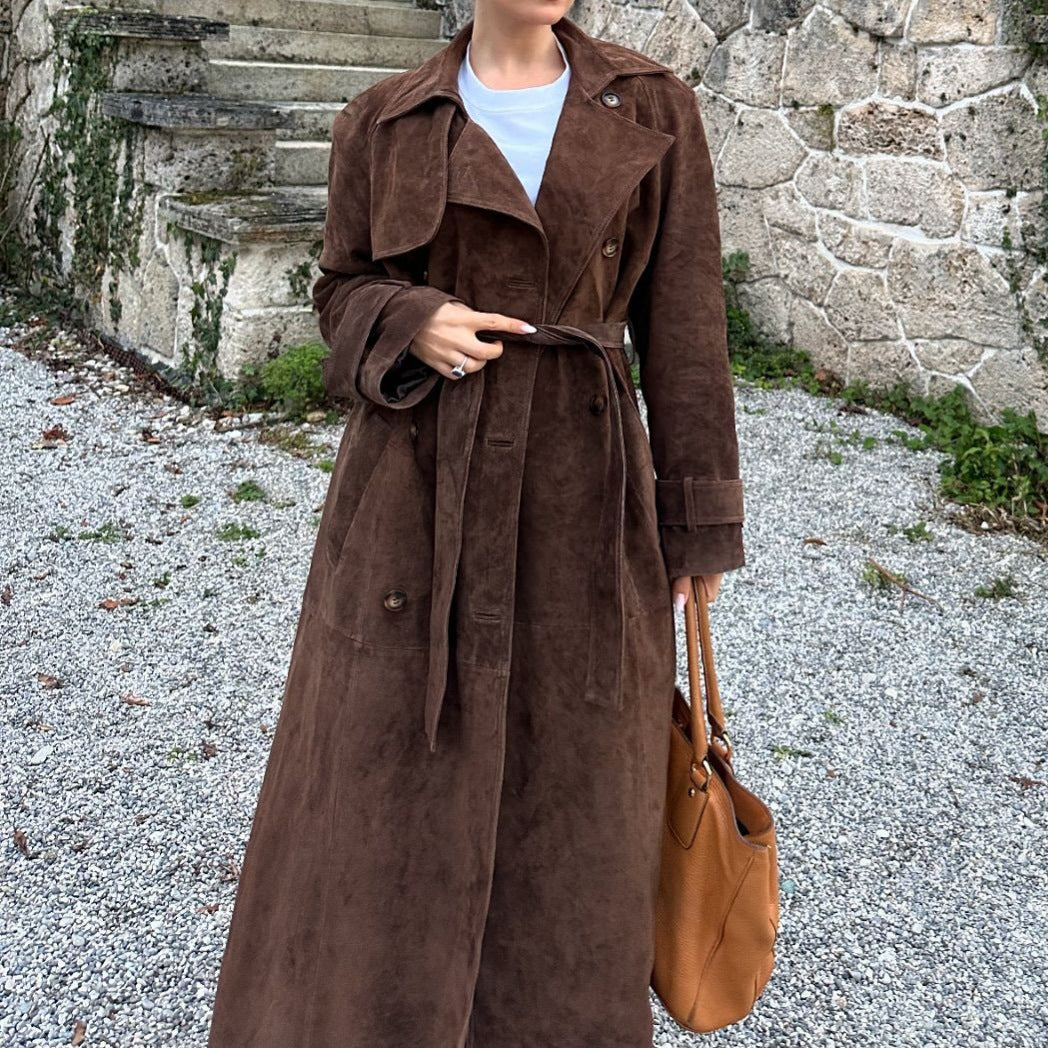 Damen Suede Trenchcoat mit Gürtel und eleganten Knopfdetails Heidi-Mode