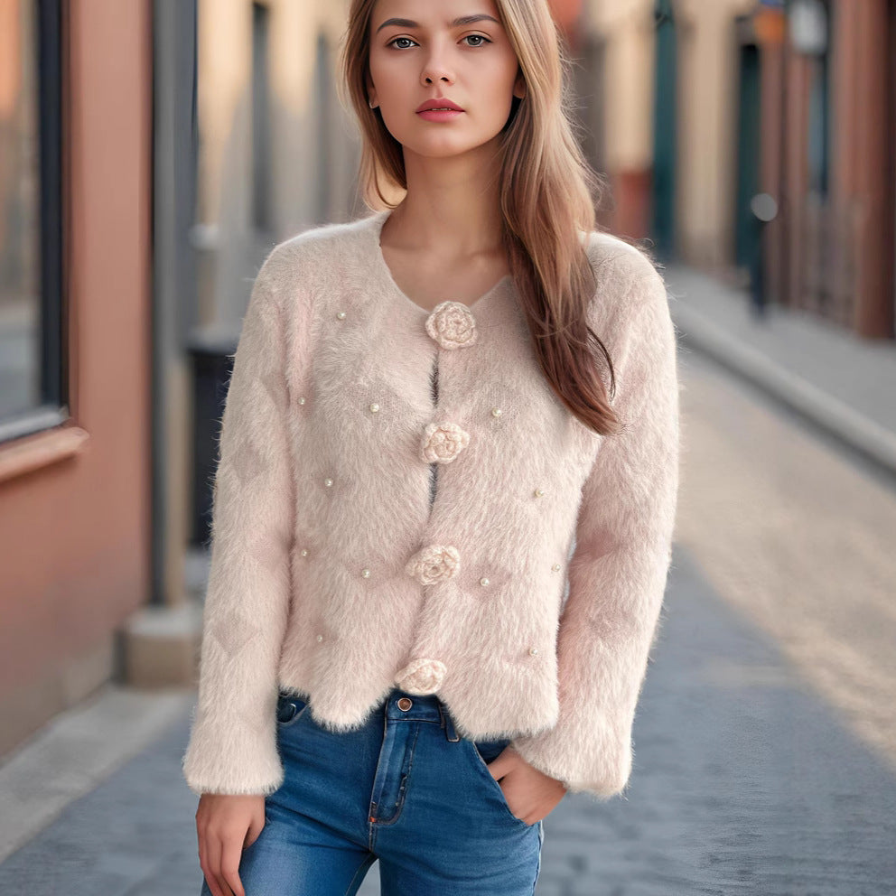 Damen Strickjacke mit floralen Applikationen und perlverzierter Detail Heidi-Mode