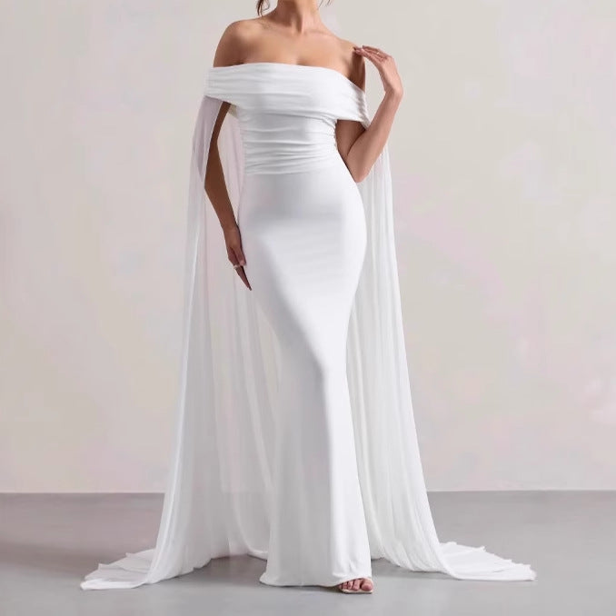 Damen Elegantes Off-Shoulder Abendkleid mit fließendem Transparenz-Cape und figurumspielendem Schnitt Heidi-Mode