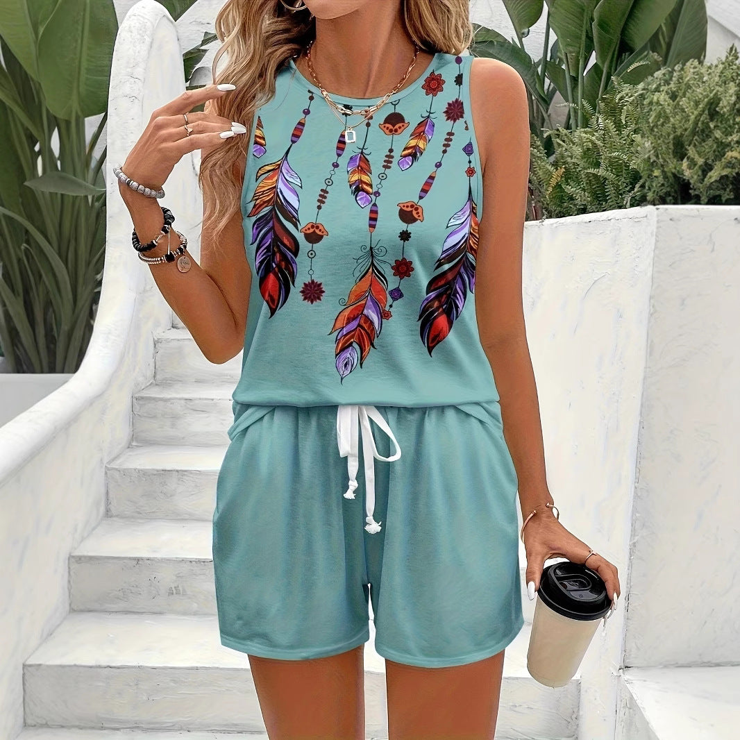 Damen Baumwoll Overall mit buntem Federmuster Heidi-Mode