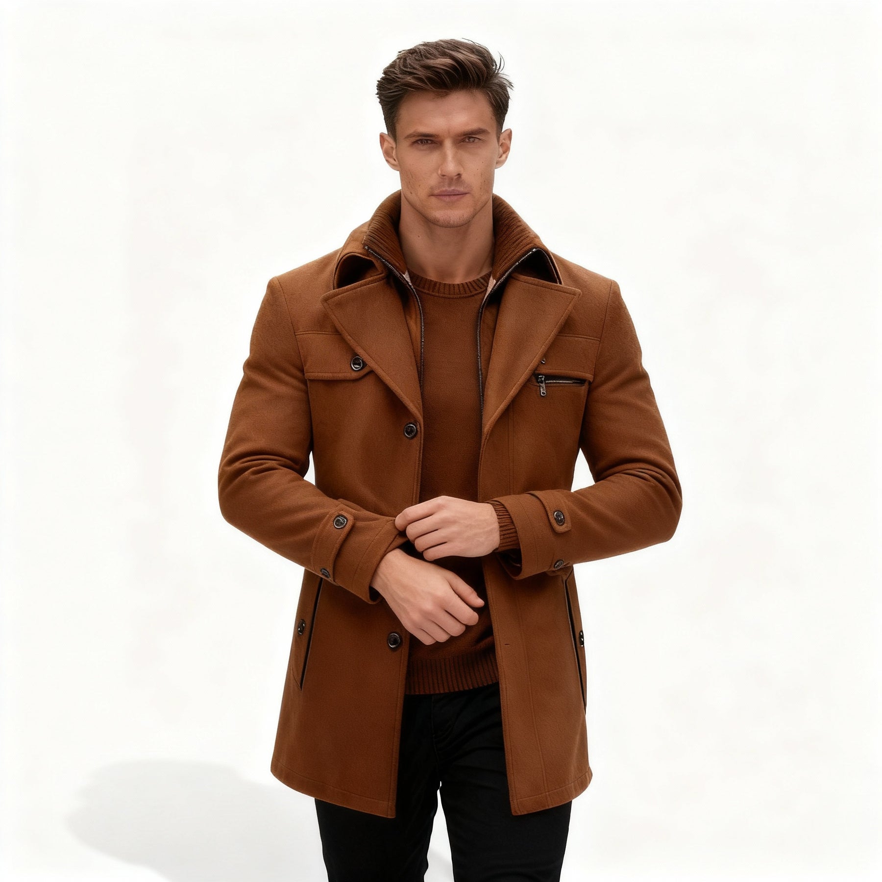 Dieser elegante Herren Komfort Wintermantel kombiniert hochwertige Materialien mit einem modernen Business-Look. Die wasserabweisende Oberfläche schützt zuverlässig, während der warme Stoff ein angenehmes Tragegefühl bietet.