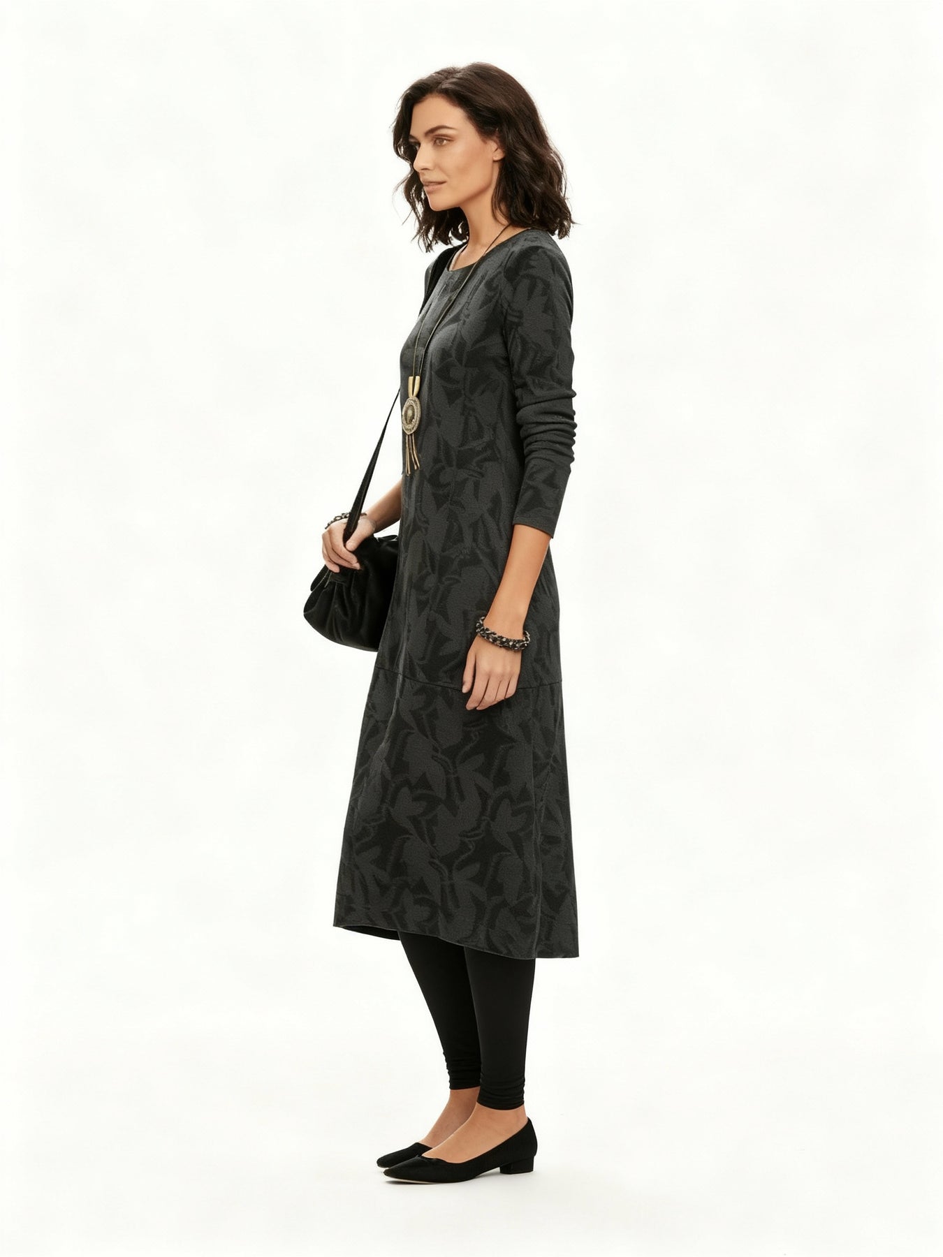 Ein warmes, bequemes Winterkleid mit elegantem Muster – perfekt für stilvolle Winteroutfits. Das hochwertige Material hält warm und verleiht Ihnen eine feminine Silhouette.