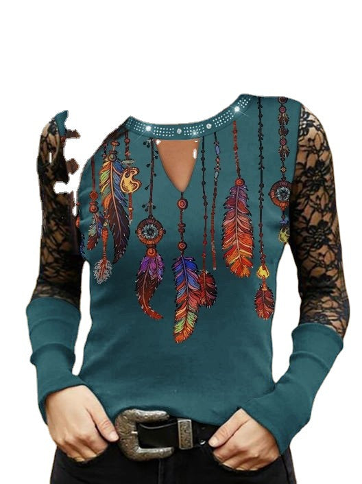 Damen Oberteil mit Spitzenärmeln und buntem Federmotiv Heidi-Mode
