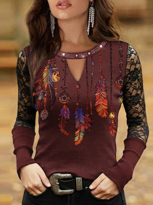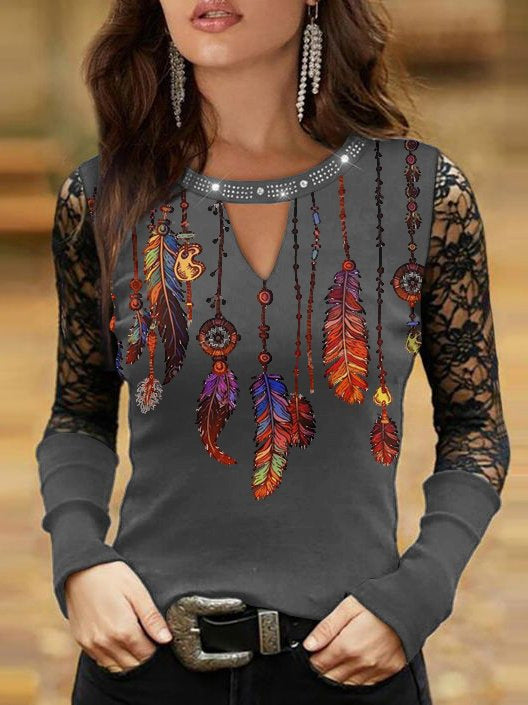 Entdecken Sie unser stilvolles und einzigartiges Oberteil mit einem ansprechenden Federmotiv und eleganten Spitzenärmeln, das Ihrer Garderobe einen Hauch von Boho-Charme verleiht. Dieses Oberteil kombiniert Komfort und modischen Stil und ist ideal für verschiedene Anlässe.