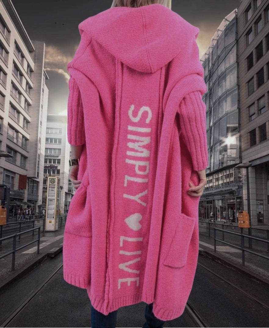 Damen Oversized Strickmantel mit Hoodie und auffälligem Schriftzug Heidi-Mode