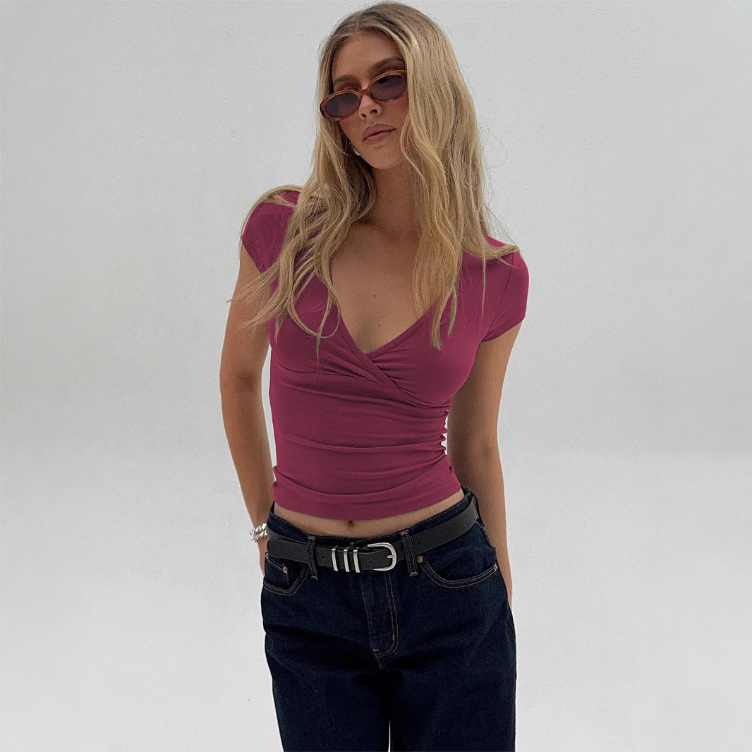 Wir präsentieren das stilvolle V-Ausschnitt-Top für Damen, eine perfekte Kombination aus modernem Eleganz und täglichem Komfort. Dieses Top verfügt über ein schmeichelhaftes Wickeldesign, das Ihre Silhouette betont und es zu einem unverzichtbaren Bestandteil jeder Garderobe macht.