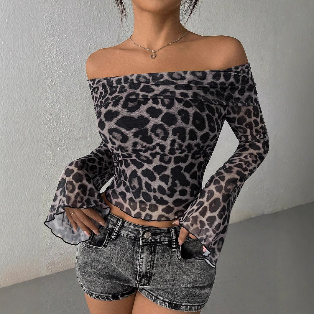 Damen Schulterfreies Oberteil mit Leopardenmuster und weiten Ärmeln Heidi-Mode