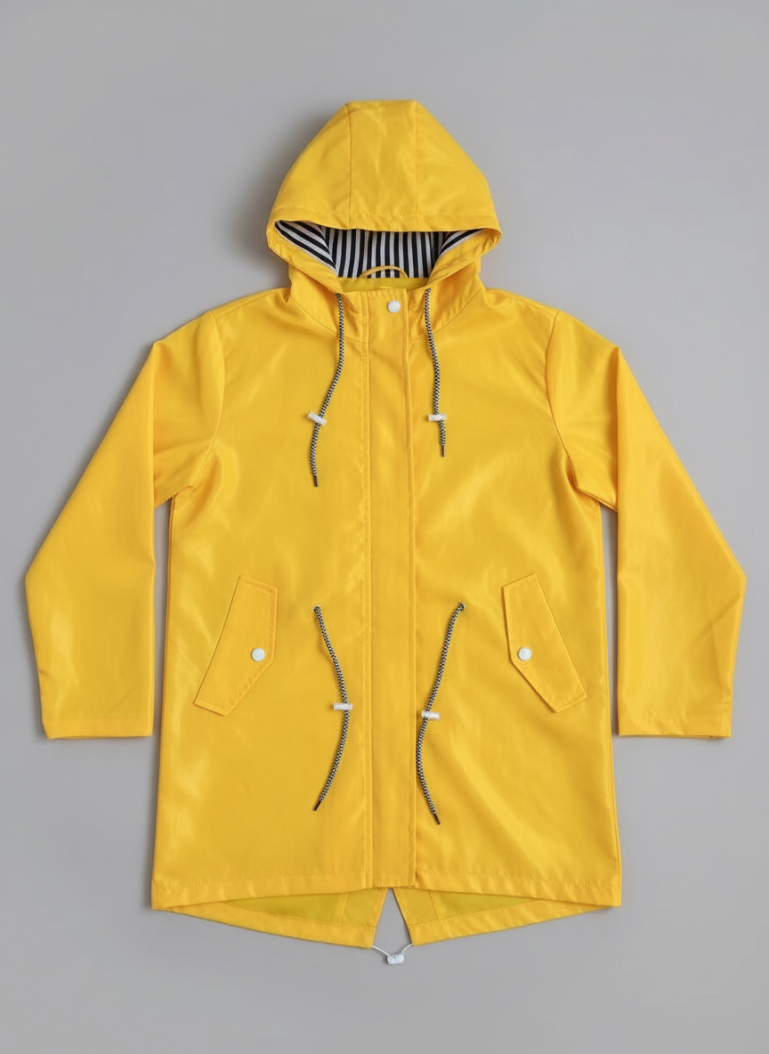 Dieser wetterfeste Mantel (Modell NCFY-16) ist als Übergangsjacke für verschiedene Wetterlagen konzipiert. Die Jacke besteht aus einer beschichteten Polyesterfaser-Mischung und verfügt über eine lockere, entspannte Passform sowie eine verstellbare Kapuze.