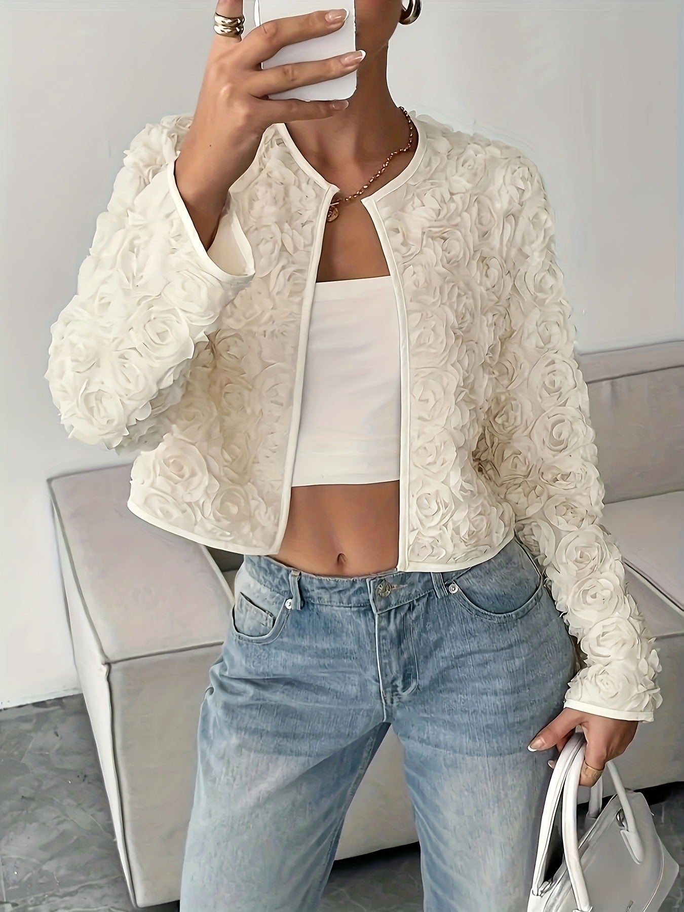 Perfekt für die Übergangszeit oder festliche Anlässe, wird diese Damen Blütenapplikationen Jacke Ihr neuer Lieblingsbegleiter. Lassen Sie sich von ihrem Charme verzaubern!