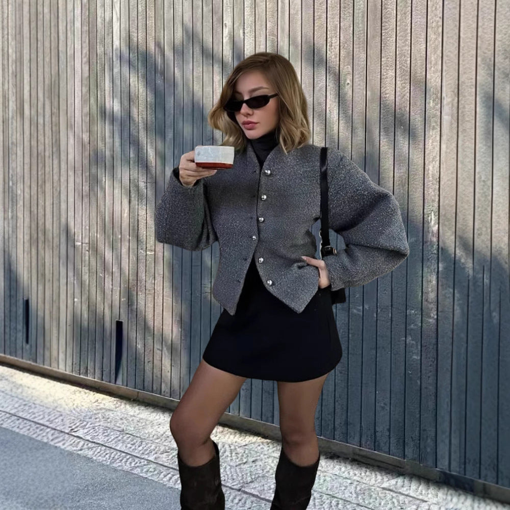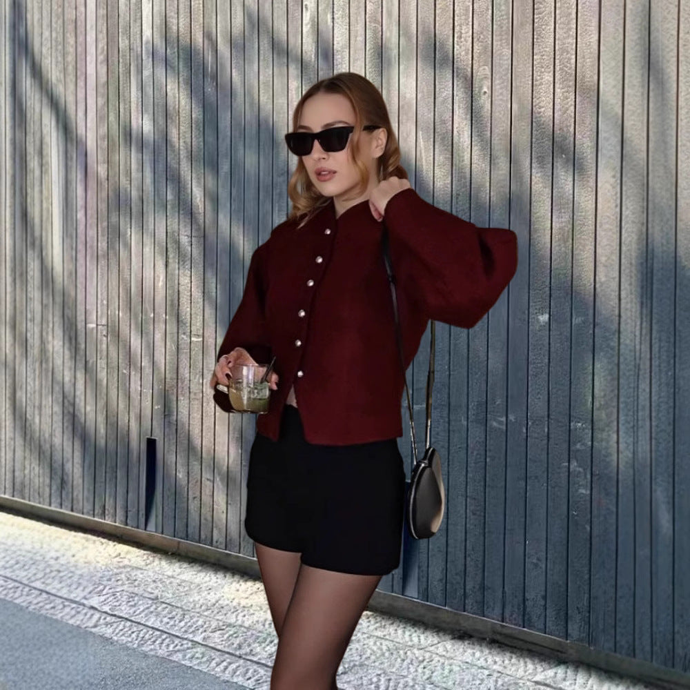 • Elegantes Design: Die Jacke bietet eine schicke Silhouette mit einem geschlossenen Design, ergänzt durch eine Reihe von stilvollen Knöpfen, die für einen femininen Touch sorgen.