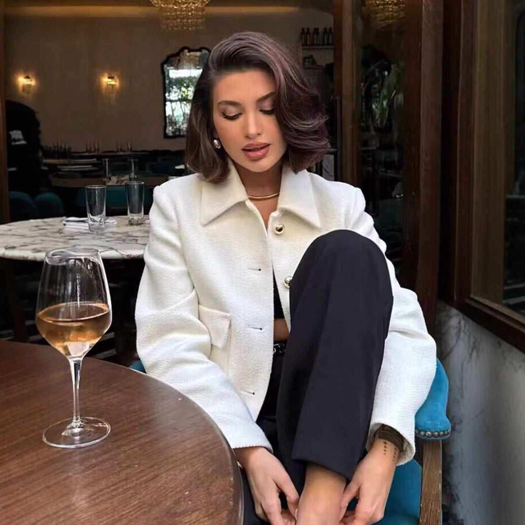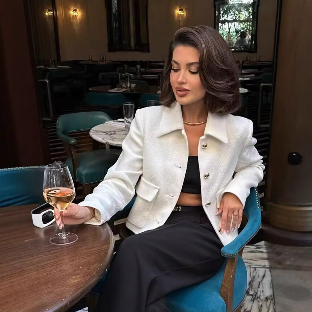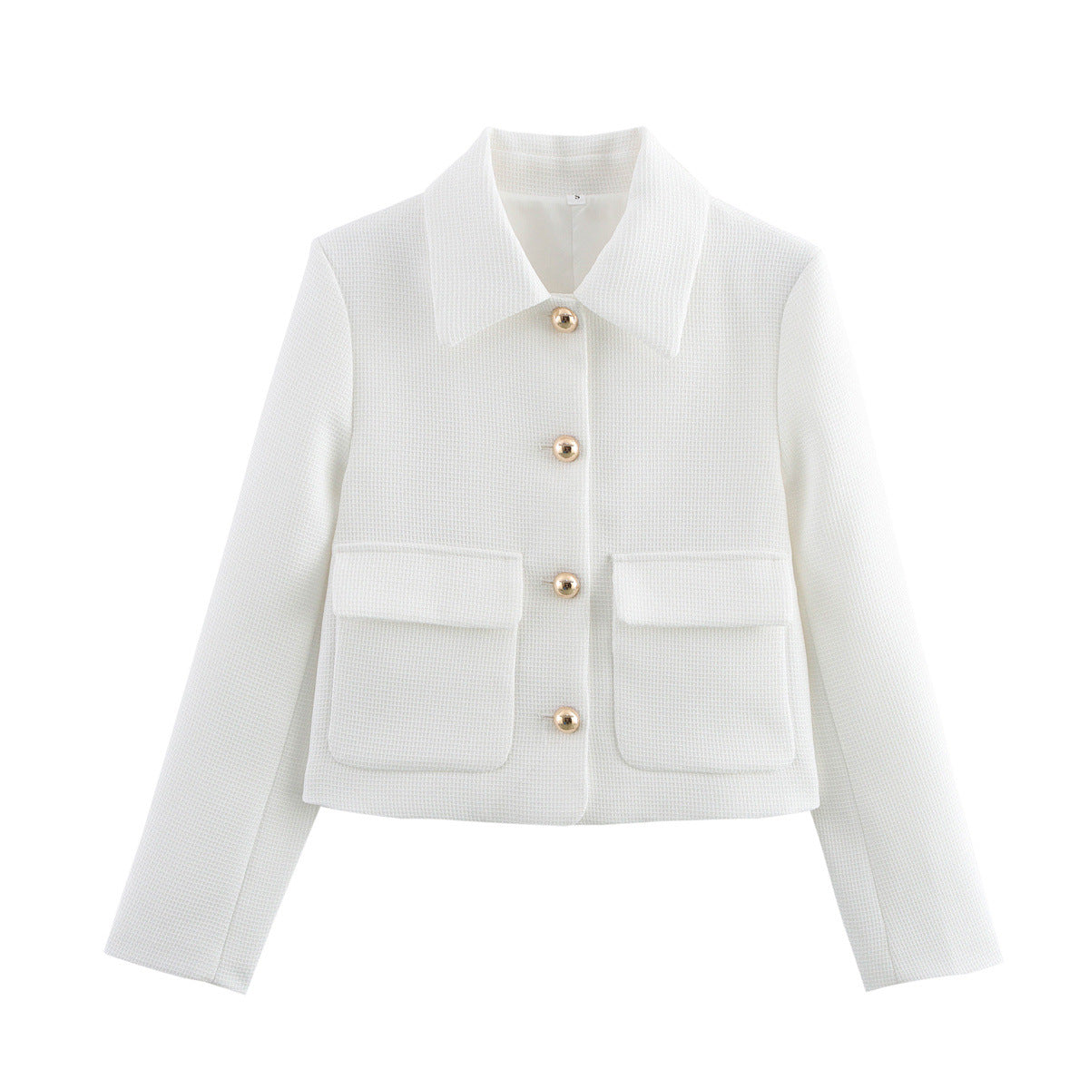- Design: Modernes cropped Design mit einem klassischen Kragen und eleganten, goldfarbenen Knöpfen, die einen luxuriösen Akzent setzen.