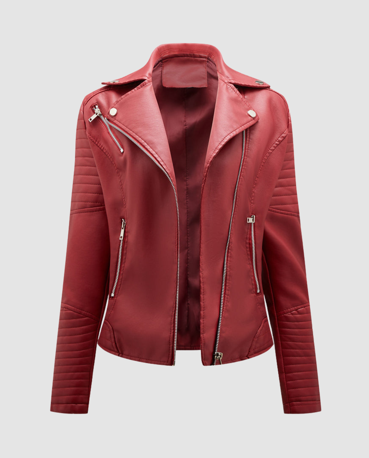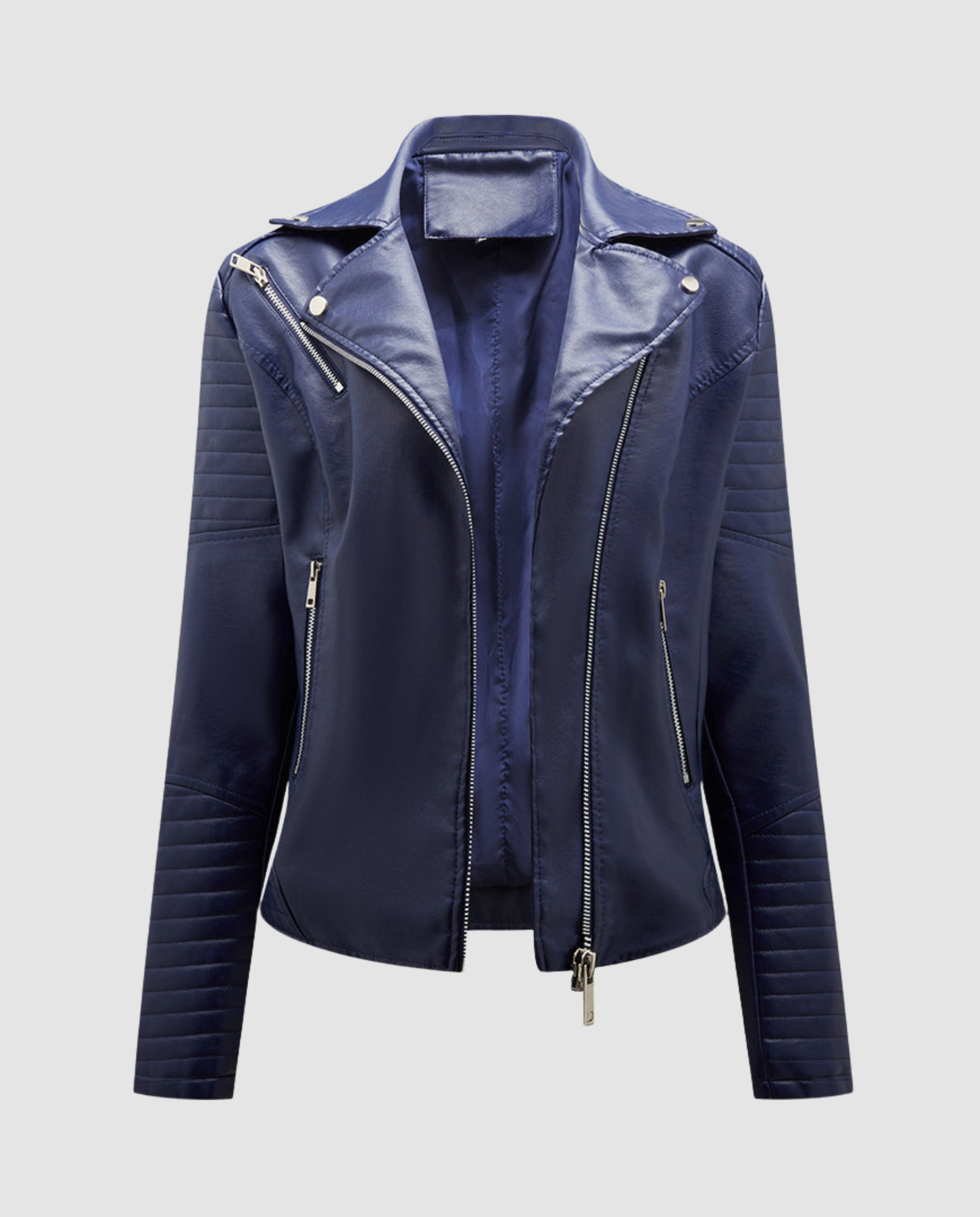 Diese elegante Kunstlederjacke für Damen vereint modernen Stil mit angenehmem Tragekomfort. Das weiche PU Material sorgt für ein hochwertiges Gefühl, während der asymmetrische Reißverschluss und der Reverskragen dem Look eine feminine und zeitlose Note verleihen.