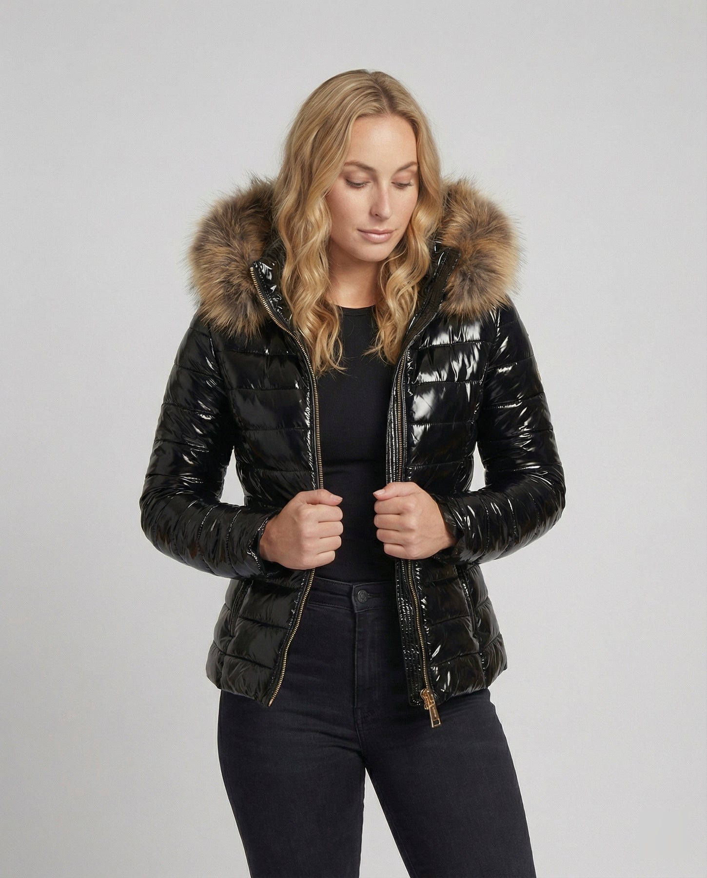 Eleganter Damen Puffermantel mit Pelzkapuze für kalte Tage