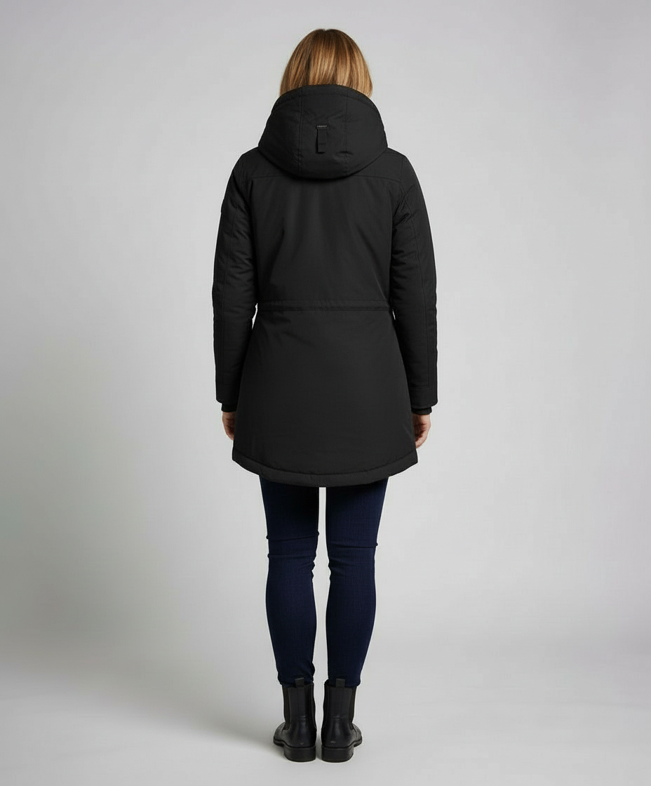Die lange gefütterte Winterjacke für Damen bietet zuverlässigen Schutz vor Kälte, Wind und Nässe. Das warme Innenfutter sorgt für hohen Tragekomfort, während die wasserfeste Außenschicht trocken hält.