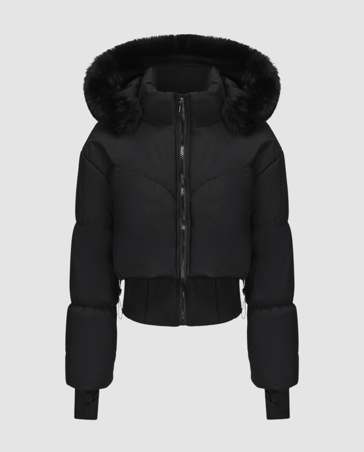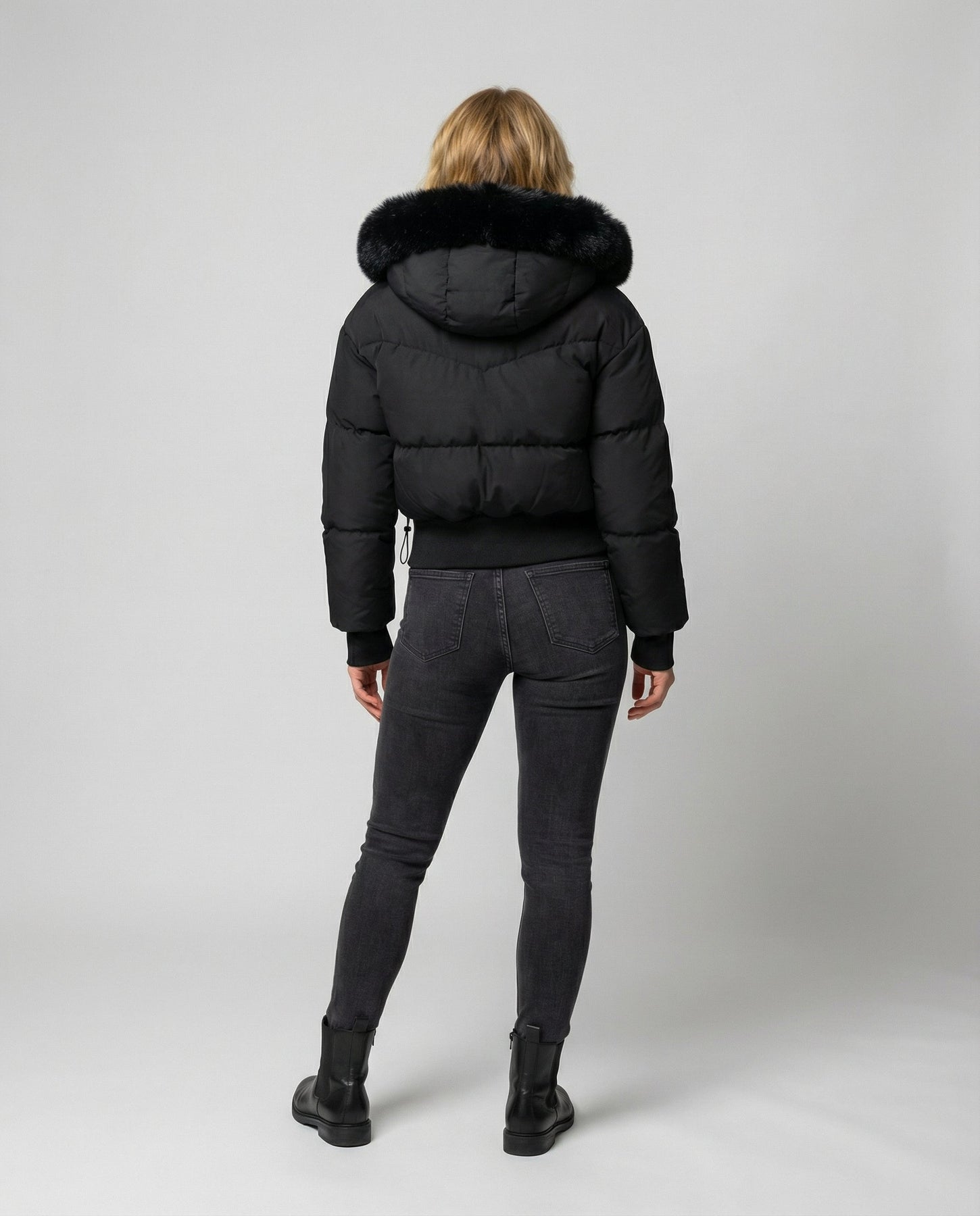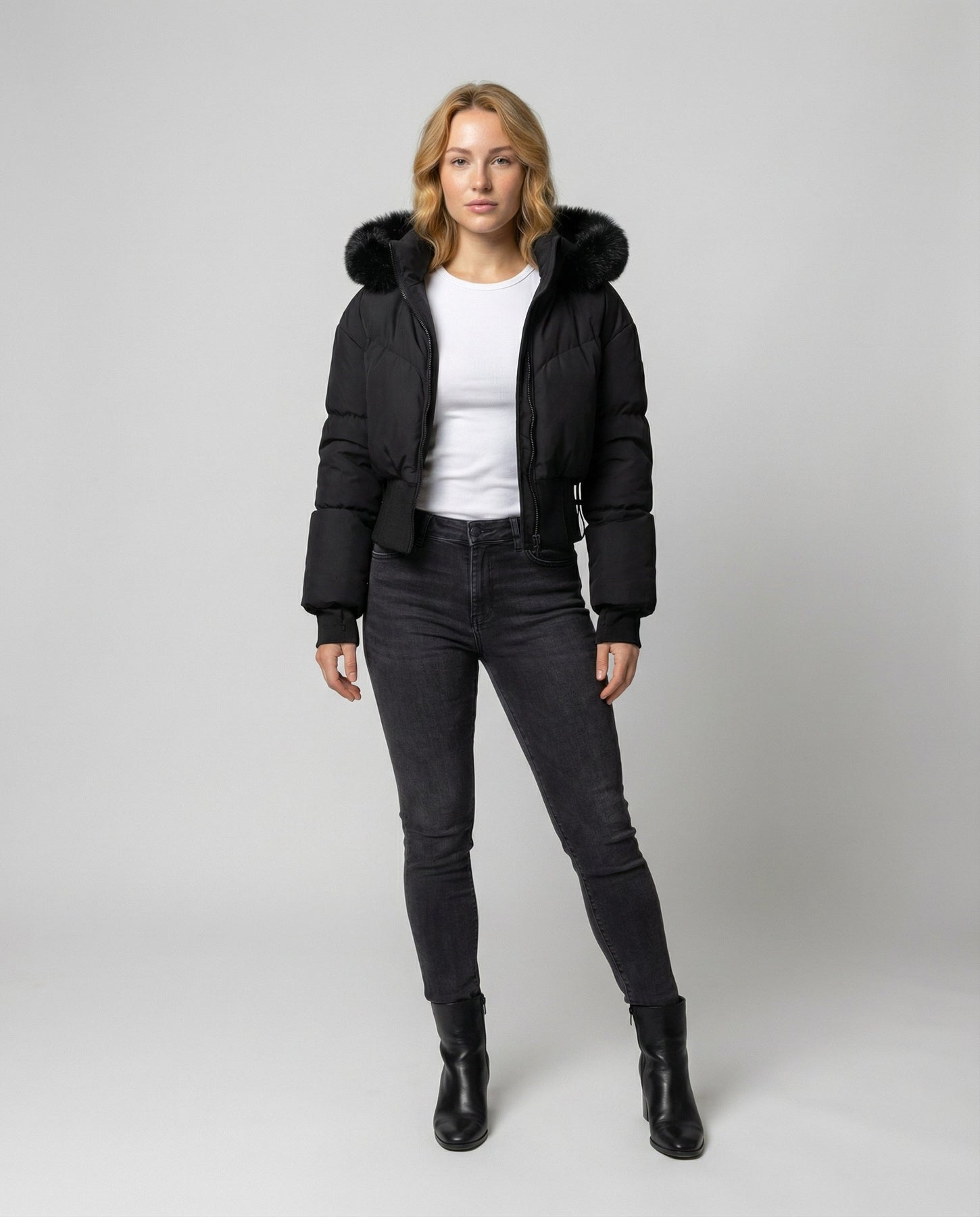 Die stylische warme Cropped Daunenjacke für Damen vereint modernen Look mit zuverlässiger Winterwärme. Das wasserabweisende Material schützt vor Kälte und Nässe, während die abnehmbare Kapuze mit Kunstfellbesatz einen eleganten Akzent setzt.
