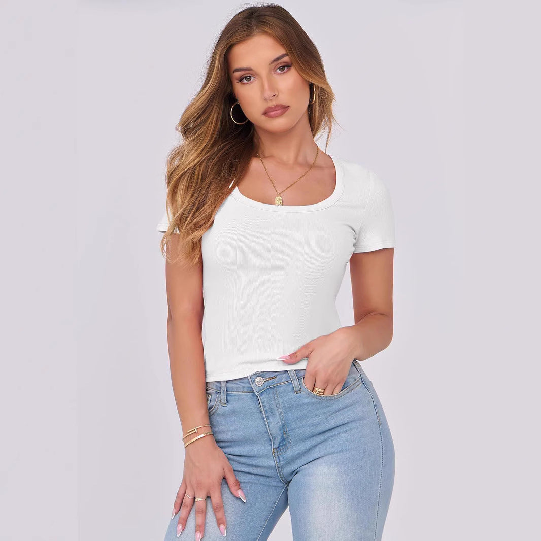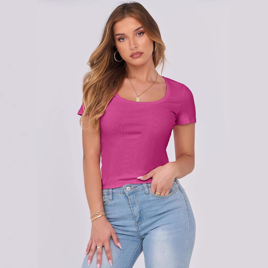 Damen figurbetontes Oberteil mit weitem Quadrat-Ausschnitt und kurzen Ärmeln Heidi-Mode