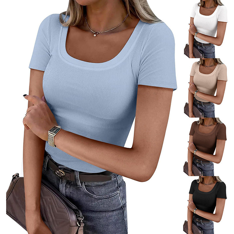 Damen figurbetontes Oberteil mit weitem Quadrat-Ausschnitt und kurzen Ärmeln Heidi-Mode