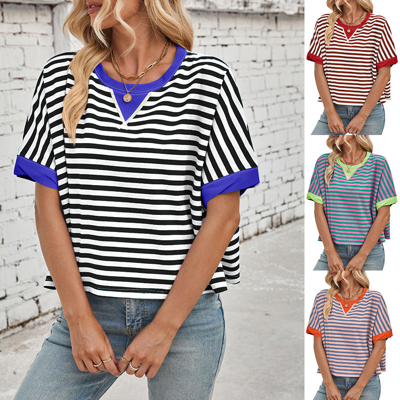 Damen lässiges Streifenoberteil mit V-Ausschnitt und Kontrastärmel Heidi-Mode