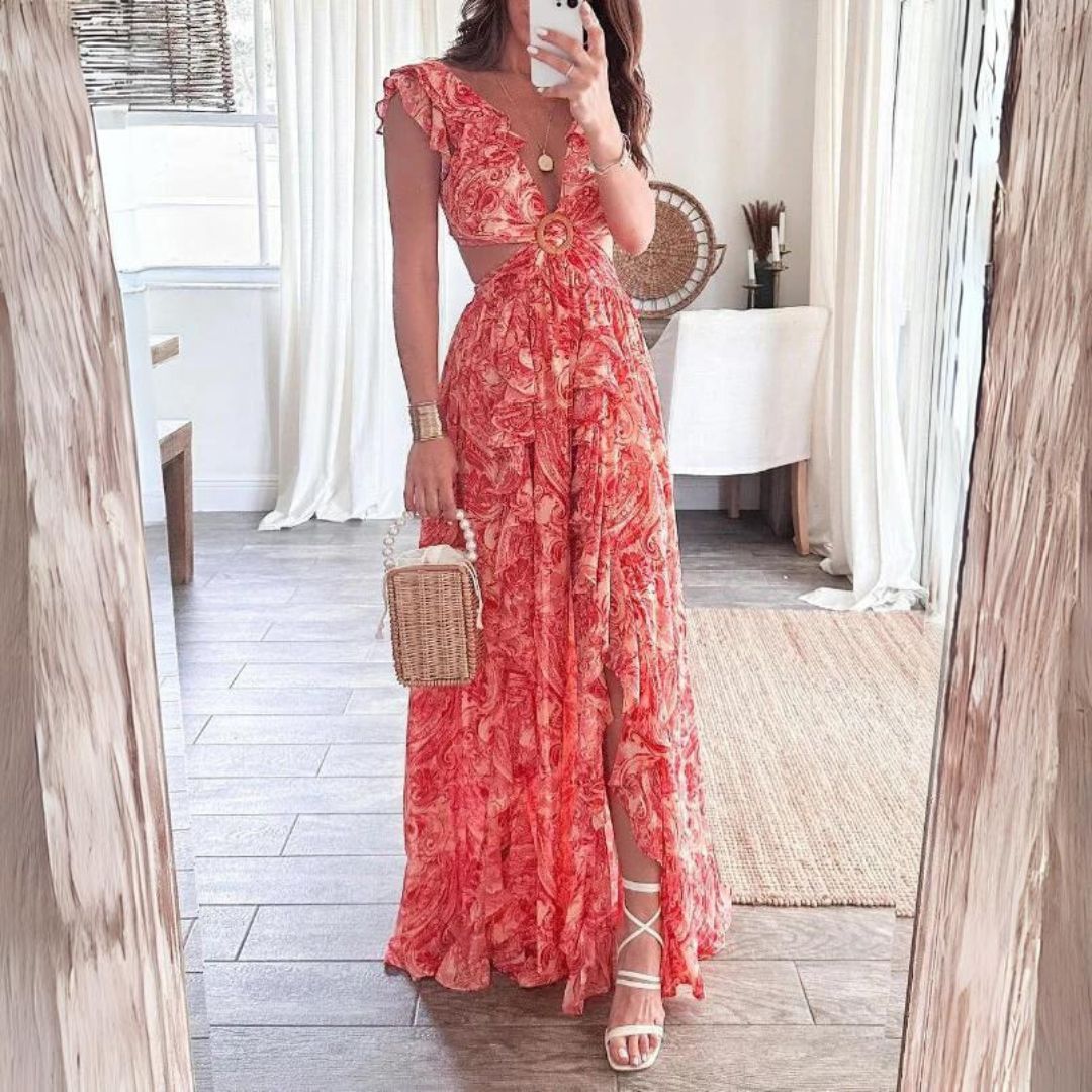 Geblümtes Maxikleid mit Rüschenärmeln und ausgeschnittener Taille