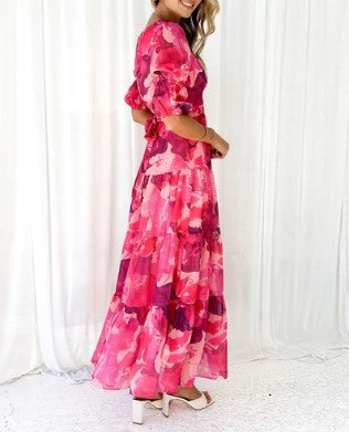 Geblümtes Maxikleid mit Rüschenärmeln und ausgeschnittener Taille