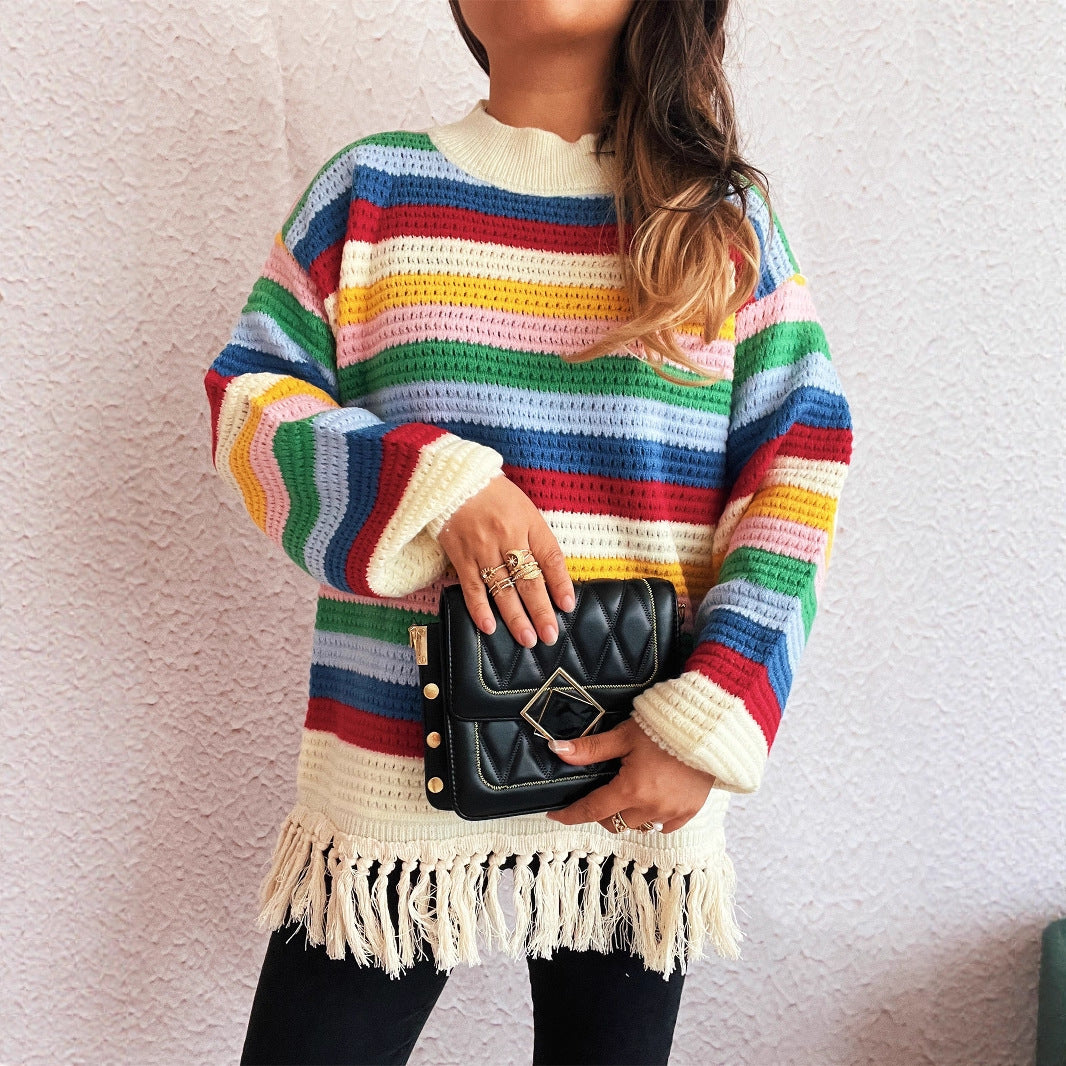 Damen entzückender Pullover mit Fransen und buntem Streifenmuster Heidi-Mode