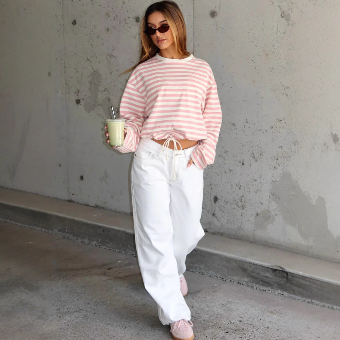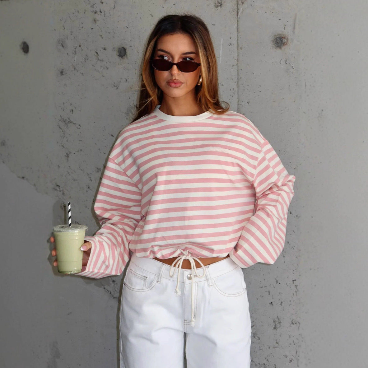 Damen lässiger gestreifter Crop-Pullover mit Kordelzug Heidi-Mode