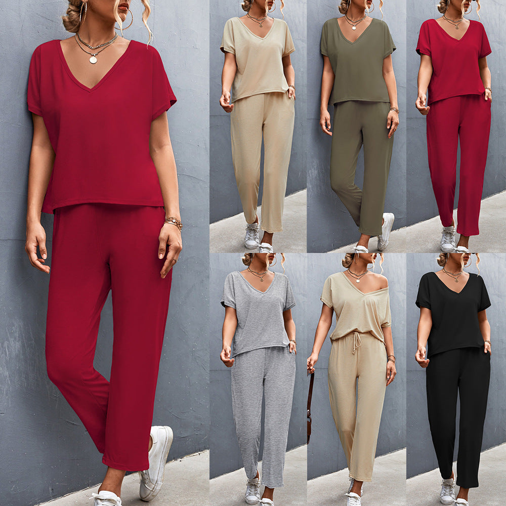 Entdecken Sie unser elegantes Damen Lounge-Set, das perfekten Komfort und stilvolles Design vereint. Dieses Set besteht aus einem lässigen Oberteil mit V-Ausschnitt und dazu passenden, bequemen Hosen. Die lockere Passform sorgt für uneingeschränkte Bewegungsfreiheit, während die elastischen Bündchen für eine optimale Anpassung an die Körperform sorgen.