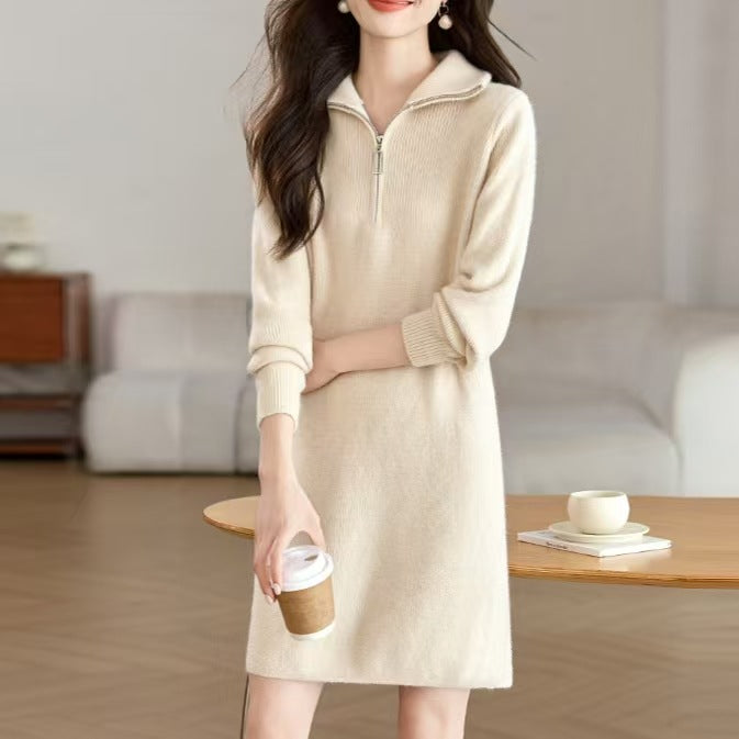 Damen Kurzes Strickkleid mit halbzipper und Kragen Heidi-Mode