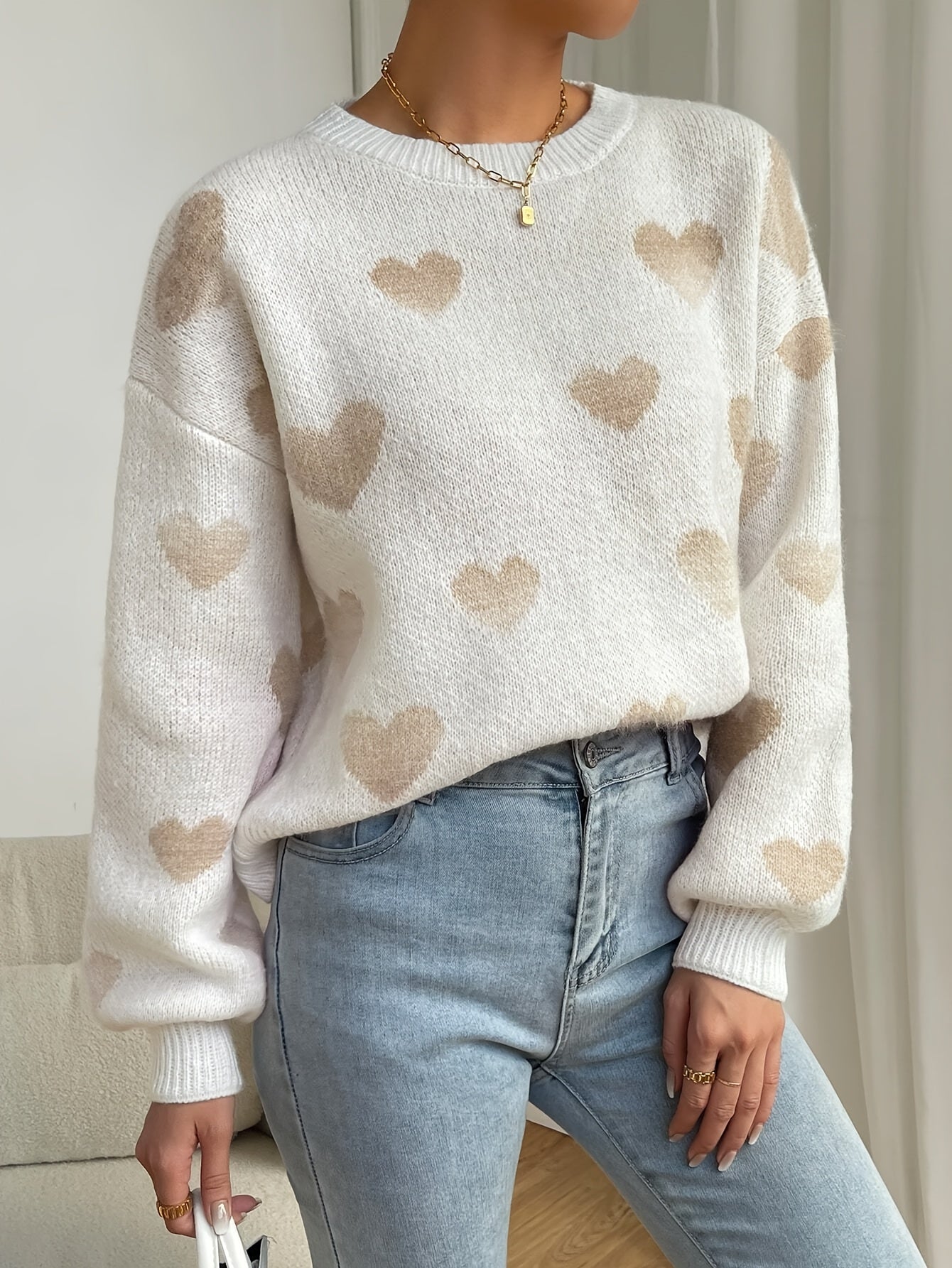 Verleihe deinem lässigen Outfit einen Hauch von Zärtlichkeit mit diesem gestrickten Pullover im Herzdesign. Dieses modische und bequeme Teil eignet sich hervorragend für jede Gelegenheit, sei es ein entspannter Tag zu Hause oder ein lässiger Ausflug mit Freunden.