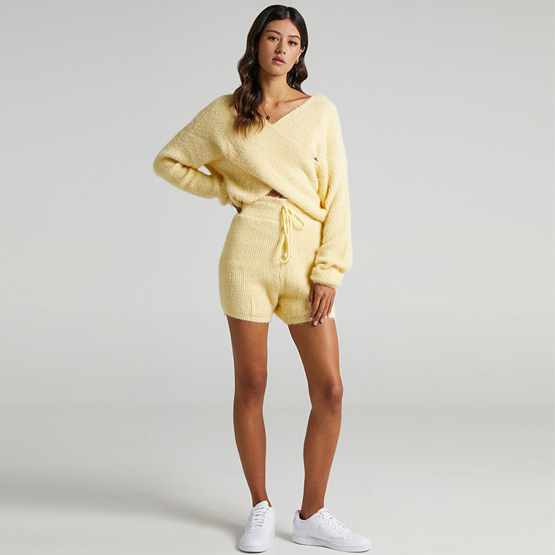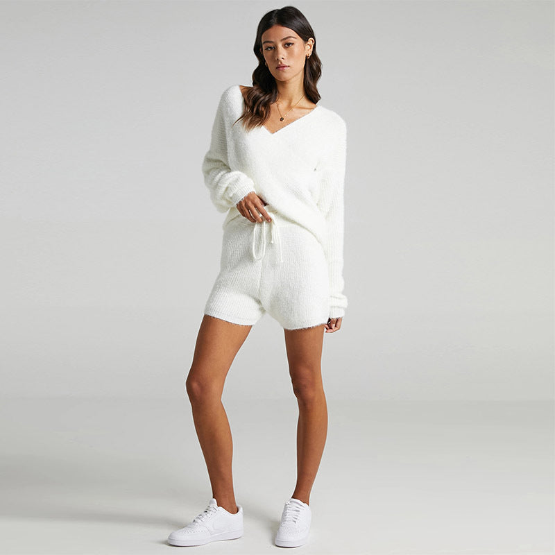 Entdecken Sie das perfekte Zusammenspiel von Stil und Komfort mit unserem Damen gestrickten Lounge-Set. Dieses Ensemble umfasst ein gemütliches Oberteil mit V-Ausschnitt und eine passende Shorts, die Ihnen nicht nur ein entspanntes Tragegefühl, sondern auch einen modischen Look bieten.