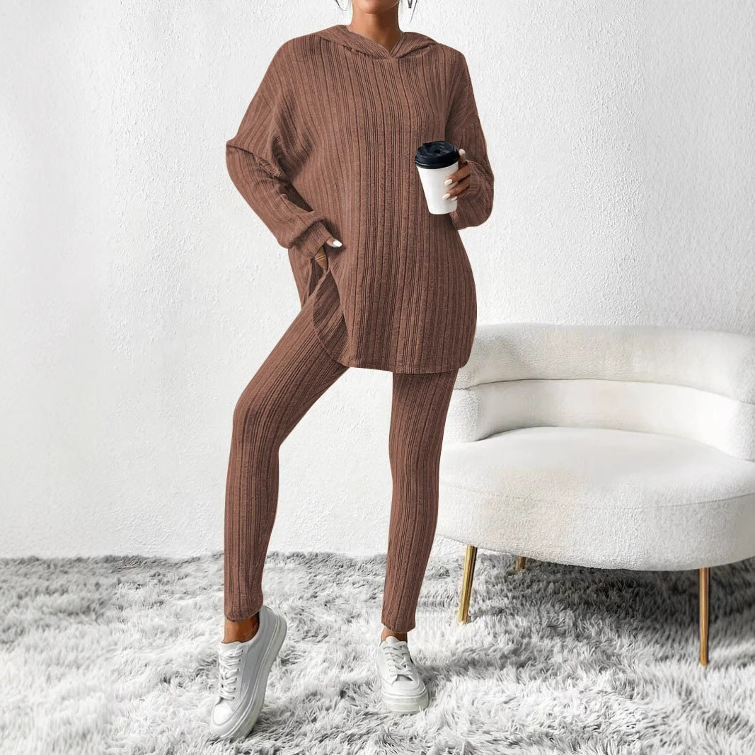 Damen lässiges Strick-Loungewear-Set mit Kapuze und breiten Beinen Heidi-Mode