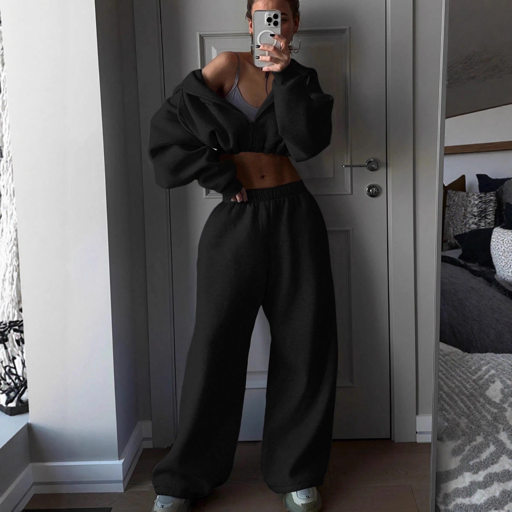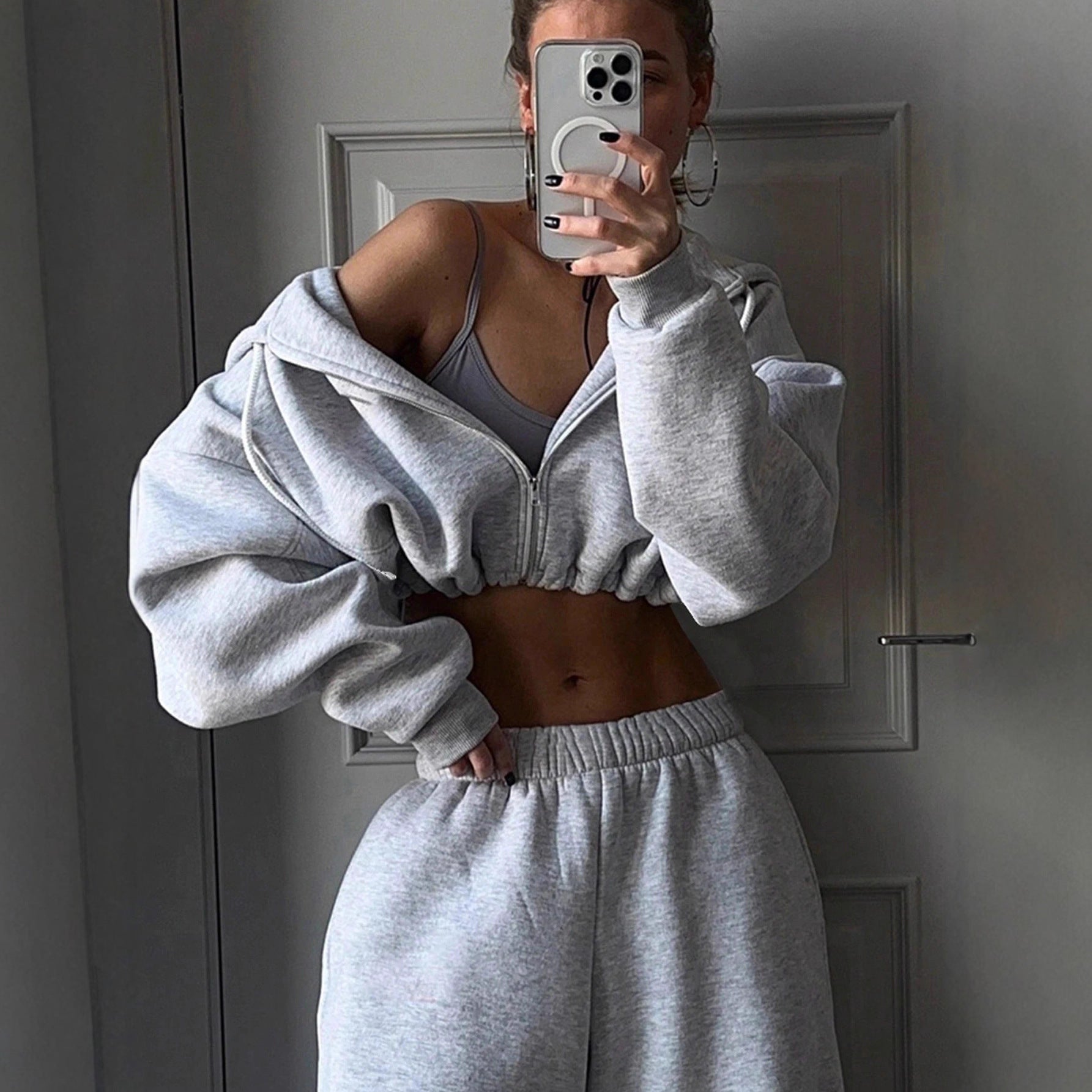 Damen lässiges Sweat-Set mit oversized Kapuzenjacke und weitem Bund Heidi-Mode